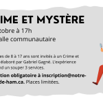 24 octobre 2025 | Souper Crime & MystèreEnvie de résoudre un crime ?? Voilà l’occasion de faire sortir le détective en toi ! Si tu as entre 8 et 17 ans, inscris toi au souper CRIME & MYSTÈRE le 24 octobre ... lire la suite