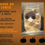 22 octobre 2025 | Heure du conteL’heure du conte vous est offerte gratuitement le 22 octobre à 18h30! Vous aurez l’occasion de créer une lanterne CITROUILLE ou MOMIE pour l’halloween. ... lire la suite