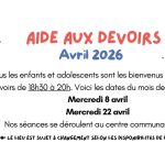 8 au 22 avril | AIDE AUX DEVOIRSVenez faire vos devoirs dans une ambiance motivante le 8 et le 22 avril dès 18h30 au centre communautaire. ... lire la suite