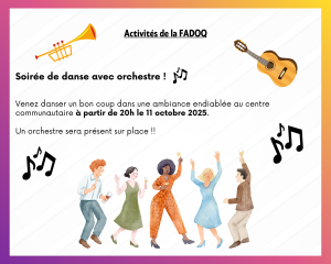 Venez danser un bon coup dans une ambiance endiablée au centre communautaire à partir de 20h le 11 octobre 2025.