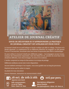 COLLAGE, ÉCRITURE ET DESSIN ! Voilà ce qui vous attend à l’atelier de JOURNAL CRÉATIF le 18 octobre de 10h à 16h ! Apportez votre lunch et prévoyez 10 $ pour cette journée unique accompagnée par Ginette Paiement, animatrice en ressourcement créatif !