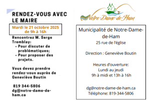 Vous devez prendre rendez-vous auprès de Geneviève Boutin au 819-344-5806 ou par e-mail au; dg@notre-dame-de-ham.ca