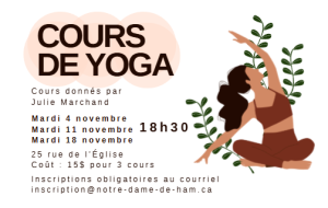 ♀️ Les cours de yoga reprennent dès le 4 novembre !Inscrivez-vous dès maintenant à cette série de 3 séances pour seulement 15 $.